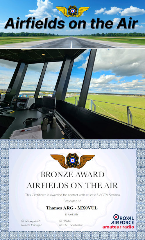 Middle picture shows the view from the new Control Tower at North Weald – visible from the M11. Bottom photo shows one of the two certificates won by TARG who made sufficient contacts to be awarded Bronze. This one is for MX0VUL at Southend, and the other, also Bronze, is for GB0NWA at North Weald.